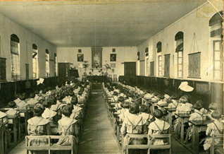 Escuela de niñas de la beneficencia valenciana (1898) regentada por monjas de congregación religiosa. Cerca de un centenar de niñas, un colectivo numeroso, están rigurosamente asentadas en pupitres. El nuevo mueble, diseñado para cubrir las necesidades de la enseñanza colectiva y graduada, permite este tipo de organización del trabajo.