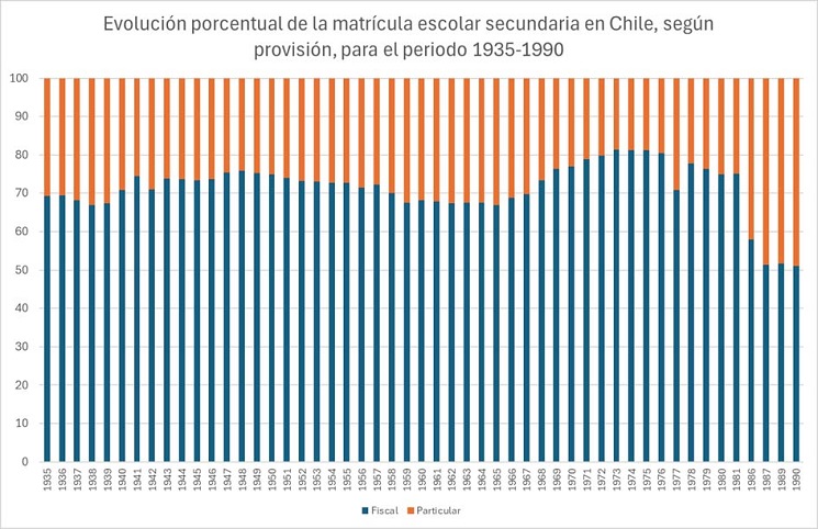 Finalmente, es importante consignar que tal fenómeno fue un esfuerzo que recayó centralmente en el Estado. Si en 1965, el 66,9% de los estudiantes secundarios asistían a escuelas públicas, en 1970 ese porcentaje había aumentado a 76,9%, el más alto hasta ese momento, desde que hemos considerado registro (ver gráfico n° 2). No obstante, para autoras como Sol Serrano, previo a la reforma de 1965 el liceo “fue perdiendo su aura”, ante el abandono de su carácter elitista y sus amenazas de masificación (Serrano, 2018).