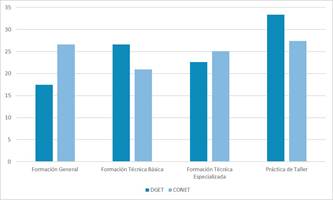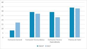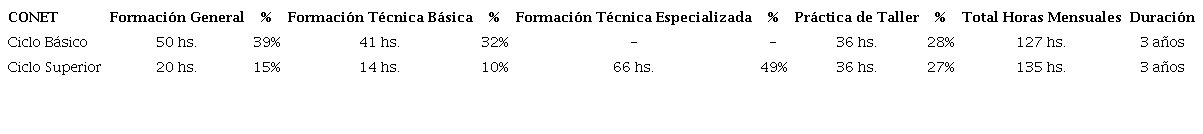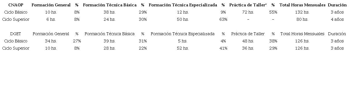 En contraste con las escuelas industriales de la DGET, los nuevos planes de estudio de las ENETs12 establecieron la homogeneidad del ciclo básico de 3 años con el del resto de las modalidades de la secundaria. De modo que la elección de la especialización se retrasó del 1º al 4º año de cursada y se incrementó la cantidad de horas destinadas a las materias de cultura general y básicas en este Ciclo Básico, en detrimento de las horas de materias específicas y de taller. Del mismo modo, se modificaron las especialidades y los contenidos de los espacios curriculares del Ciclo Superior, duplicando la cantidad de horas dedicadas a las materias de cultura general y reduciendo a la mitad las horas de las materias básicas, incrementando las horas de la formación técnica específica, y manteniendo la cantidad de horas de práctica de taller (Tabla 3Gráfico 2).