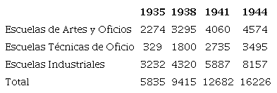 El crecimiento de la matrícula en estos tres tipos de ofertas educativas (Tabla 1) entre 1930 y 1940 muestra el avance de la educación técnica con base en estudios primarios completos y mayor carga horaria de formación general, dado el mayor crecimiento relativo de la matrícula de las Escuelas Industriales y las Escuelas Técnicas de Oficio.