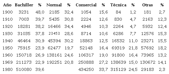 En segundo lugar, el aumento de la formación general en la secundaria no se realizó mediante la implementación de una escuela comprehensiva como en otros países, sino por medio del establecimiento de un ciclo básico común en la escuela media sin eliminar la diferenciación por modalidad. El sentido de la modalidad técnica salta a la vista al reconocer el importante componente de práctica de trabajo manual en oficios que complementaba la formación universal del ciclo básico, además de la que se ofrecía en el ciclo superior, junto a horas de formación científico tecnológica.
