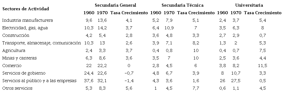 De este modo, la escolarización de la población argentina se incrementó en todos los niveles educativos, particularmente hacia mediados del siglo XX (Fernández, Lemos y Wiñar, 1997), con énfasis en la educación secundaria técnica entre 1960-1970 (Acosta, 2023). A continuación, puede observarse que los trabajadores más calificados en 1960 y 1970 eran los del sector de servicios al público y a las empresas, servicios de gobierno y comercio, pero los trabajadores de la industria manufacturera, de electricidad, gas y agua, así como de agricultura y de minería presentaban las mayores tasas de crecimiento en su acceso a la escolarización secundaria y, particularmente de la secundaria técnica. (Tabla 5)
