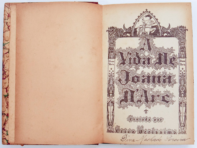 A folha de rosto informa, além do título da obra, a frase “Contada por Erico Veríssimo”, (Fig. 3) tudo envolto por moldura ricamente detalhada com adornos que remetem à Idade Média e mostram Joana D’Arc, vestida para batalhas com asas que se referem a uma figura santificada em cima de uma fogueira, em alusão não só a sua morte na fogueira mas também ao modo de demonstrar sua vitória após a santificação. Leões alados, brasões, objetos sacros e coroas compõem o adorno. O nome do ilustrador - Nelson Boeira Faedrich - surge em folha separada, informando que, além da capa, é o responsável pelo frontispício e pelas letras capitulares.