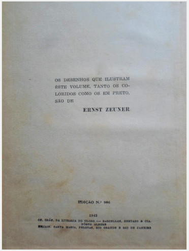 O nome do ilustrador, Ernst Zeuner, não aparece na capa ou na folha de rosto. Todavia, a indicação de autoria das ilustrações surge em uma página separada, com o texto: “Os desenhos que ilustram este volume, tanto os coloridos como os em preto, são de Ernst Zeuner” (Fig. 5). Esta mesma página anuncia ainda a edição, o ano de publicação, o nome da empresa, a cidade sede e as cidades das filiais da casa editora - Santa Maria, Pelotas, Rio Grande e Rio de Janeiro.