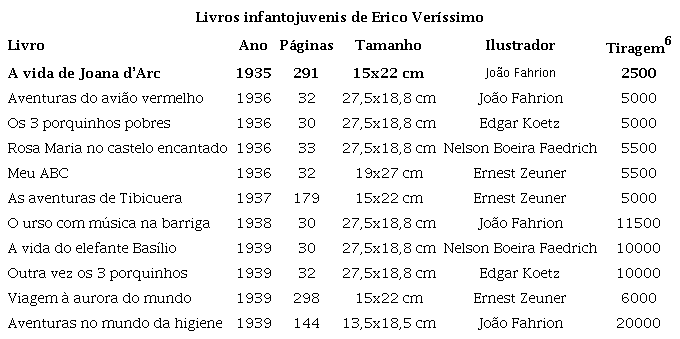 Entre 1935 e 1939, Erico Verissimo publicou os livros infantojuvenis A vida de Joana d’Arc (1935), Aventuras do avião vermelho (1936a), Os três porquinhos pobres (1936b), Rosa Maria no Castelo Encantado (1936c), Meu ABC (1936d), Aventuras de Tibicuera (1937), O urso com música na barriga (1938), A vida do elefante Basílio (1939a), Outra vez os três porquinhos (1939b), Viagem à aurora do mundo (1939c) e Aventuras no mundo da higiene (1939d).