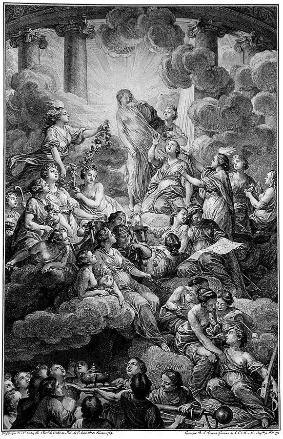 The frontispiece synthetizes the way in which science was socially organized. In the upper section of the engraving, at center, we see Truth covered by a veil. At her right are Reason and Philosophy, who both remove the veil covering the body of Truth: one lifts the veil while the other tears it, symbolizing the scientific explanation of nature by analyzing empirical facts. Kneeling at Truth's feet is Theology, bathed in the same light illuminating Truth. Continuing to the right are Memory, Ancient History, Modern History, Written History and Time, emerging as supporters and pillars for the rational procedures of science. Below them are Geometry, Astrology, and Physics, and farther below are Optics, Botany, Chemistry, and Agriculture. At bottom are the representations of Professionals and Craftsmen, social entities responsible for the general dissemination of science among society.2 At the top and to the left of Truth is Imagination, whose function is to beautify and to crown Truth. Below is Poetry in its different genres: Epic, Dramatic, Satirical and Pastoral. These are followed by the arts of imitation: Music, Painting, Sculpture and Architecture. According to Prévost, this encounter takes place in the Sanctuary of Truth. With this vision of science in mind, we can return to our analysis of the Encyclopédie's introductory chapter.