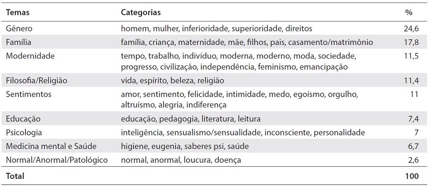 Por meio do software linguístico WordSmith Tools (2015), foram quantificados os assuntos mais frequentes na revista, de modo a agrupá-los em categorias segundo o vocabulário dos próprios atores (Tabela 1). Foram selecionados 1.235 textos de seções com participação dos leitores, como "Os homens são assim…”, "Dê sua opinião… por 20$000”, "Retratos antropológicos”, e demais matérias sobre papéis sociais e modernidade.