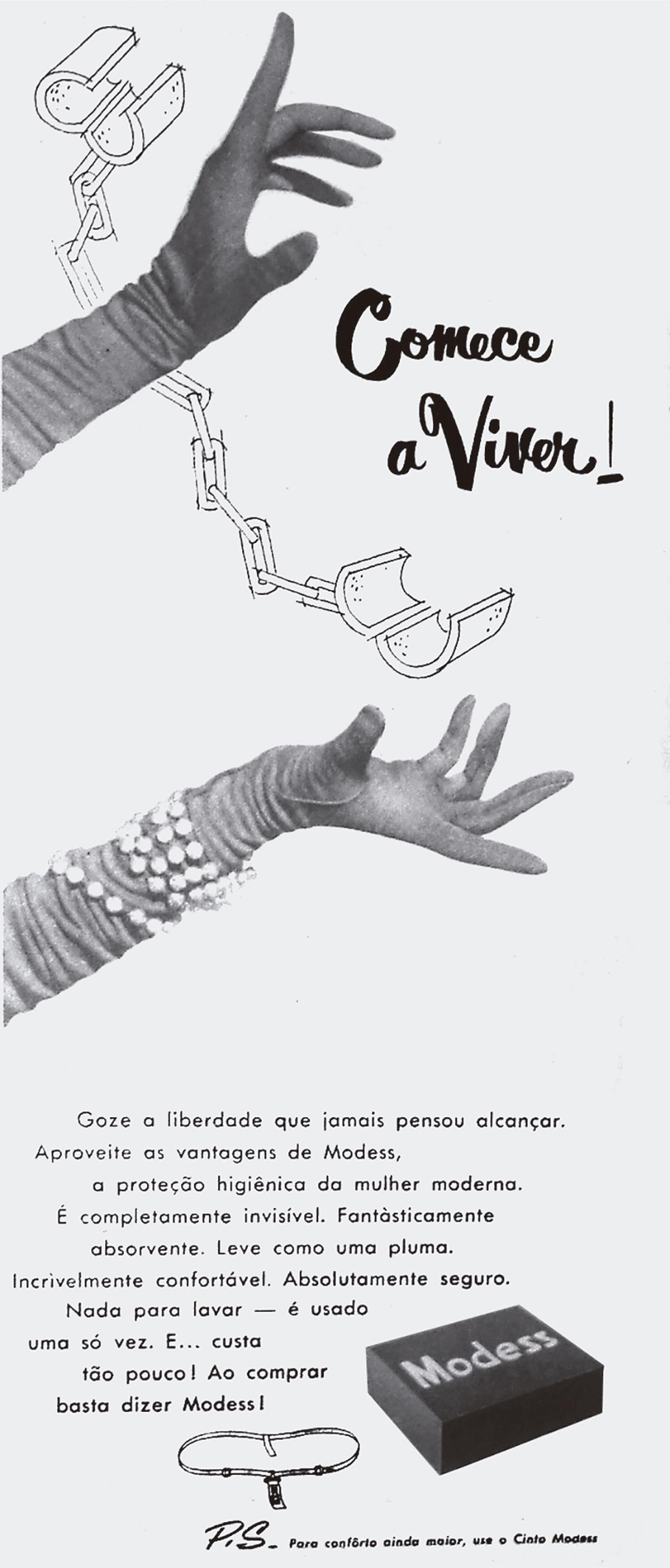 Um desses anúncios é bastante simbólico. Uma mulher de costas comemora sua liberdade propiciada pelo produto. Ao lado dela, uma bola de ferro com a corrente arrebentada simbolizava sua libertação: “Goze a liberdade que jamais pensou alcançar. Aproveite as vantagens de Modess, a proteção higiênica da mulher moderna… Nada para lavar – é usado uma só vez. E… custa tão pouco!” (O Cruzeiro, 11 dez. 1954, p.72). Essas representações foram constantes nos anúncios do absorvente Modess: mulheres rompendo cercas de arames farpados, libertando-se de grades. Em outro, as mãos se libertavam das algemas: “Comece a viver”, conclamava o anúncio (Manchete, 29 jan. 1955) (Figura 2). Anúncios que apontavam a atuação das mulheres para além do universo doméstico. Por outro lado, também figuravam mães que orientavam suas filhas a esclarecer dúvidas sobre a menstruação: “Sua filha pode ter receio de perguntar… Mas, ela precisa conhecer ‘certos fatos’ relacionados com a vida feminina. Sua filha lhe agradecerá,… se a senhora a preparar desde já para receber como normais, certas transformações que ocorrem na vida de toda mulher” (O Cruzeiro, 4 set. 1954, p.24). O anúncio de Modess oferecia um livro com linguagem “simples” e “compreensível” com explicações sobre o organismo feminino.