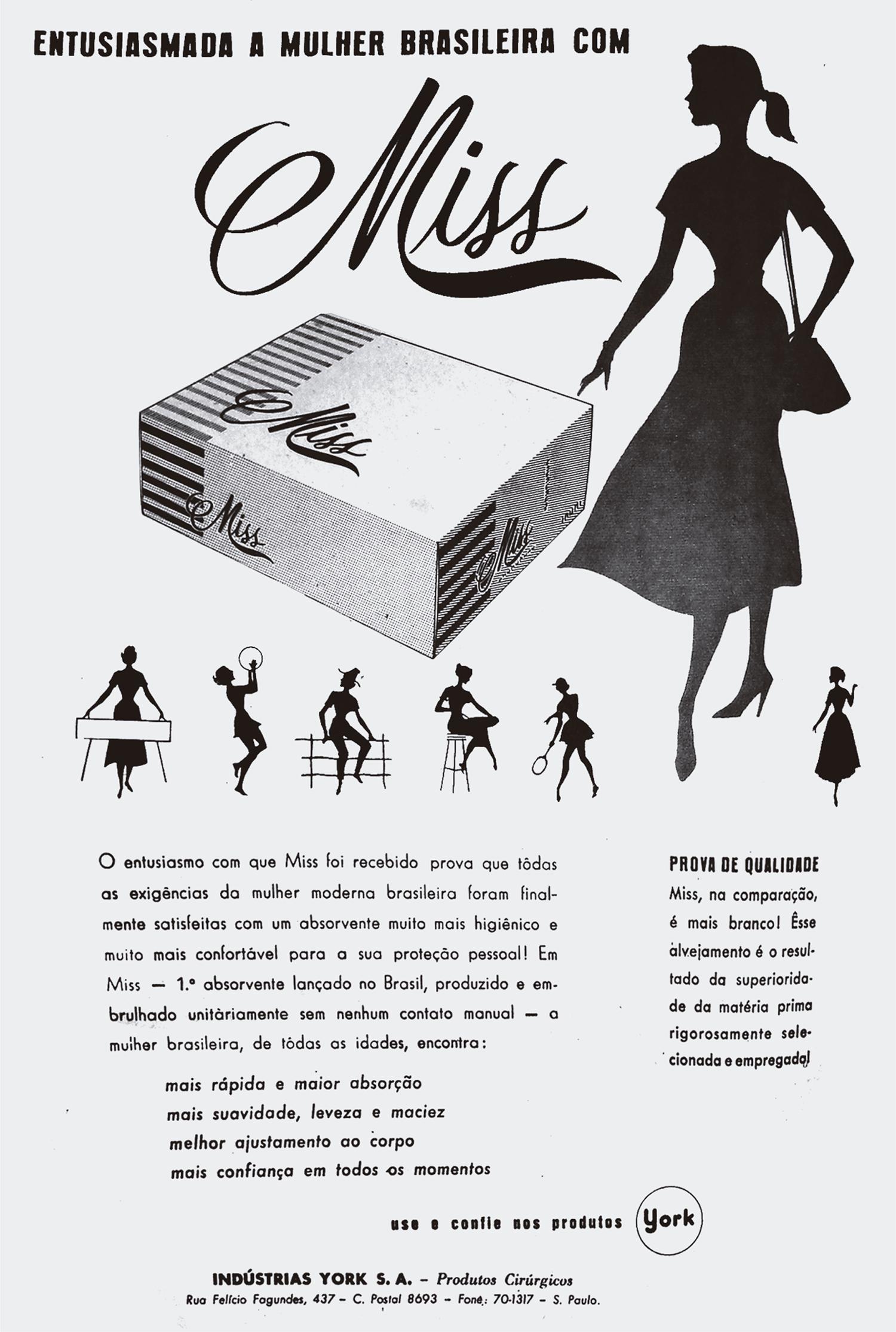Essa valorização do universo doméstico, enfatizando a mulher em suas funções de mãe, esposa e dona de casa, vai ao encontro do recuo do movimento feminista entre as décadas de 1930 até o final da década de 1960. Isso não significa que não houve manifestações lideradas pelas mulheres nesse período. Pelo contrário, “houve momentos importantes da participação da mulher, como o movimento no início da década de 1950 contra a alta do custo de vida” (Pinto, 2003, p.11). Essas ações, entretanto, não são consideradas feministas naquilo que se refere à “transformação da condição da mulher na sociedade” (p.10-11). Os anúncios dos absorventes higiênicos, independentemente da marca, estavam entre os que mais apresentaram a mulher em outros papéis além da maternidade e do casamento. A substituição dos paninhos pelos absorventes higiênicos promovia comodidade, praticidade e mais higiene, ao se utilizar o produto e jogá-lo fora. Além desse aspecto funcional do produto, há outro simbólico. O fato de ser descartável – e se proclamar mais higiênico – permitiria às mulheres que exercessem suas funções de trabalho mesmo durante a menstruação.