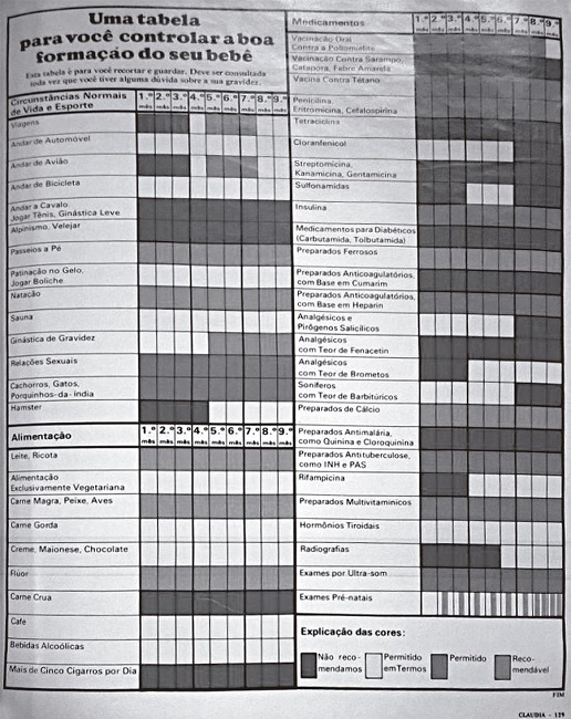“Um guia completo para os nove meses da gravidez” é o que prometia uma matéria, com chamada de capa, publicada em janeiro de 1978. O caráter educativo/normativo ficava claro no subtítulo: “Veja o que você pode fazer na gravidez, desde andar de bicicleta até nadar. E acabe com os tabus” (Sumário, jan. 1978, p.1). A reportagem analisava uma lista extensa de atividades cotidianas e indicava em uma tabela colorida (Figura 1) o que era “recomendado” (azul [cinza claro]), “permitido” (verde [cinza médio]), “permitido em termos” (amarelo [branco]) ou “não recomendado” (vermelho [cinza escuro]) à gestante: beber, fumar, sair, viajar, manter relações sexuais, praticar esportes, usar soníferos e outros medicamentos, ter contato com animais e muito mais. “Para você controlar a boa formação do seu bebê”, a revista sugeria que as futuras mamães a recortassem e guardassem, para consultá-la periodicamente.