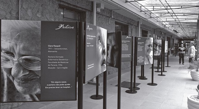 A exposição tem aproximadamente 70m2 e compõe-se de 12 grandes painéis (Figura 1). Cada um deles é constituído por fotografias de médicas, parteiras ou benzedeiras, e por informações como datas de nascimento, cidade natal, data de formatura e faculdade (no caso das médicas) e uma frase selecionada da narrativa de vida coletada (Figura 2). Cinco expositores com objetos históricos apresentam instrumentos obstétricos utilizados por médicos e parteiras, como fórceps, tesouras, antigos manuais e tratados de obstetrícia, água benta e orações para benzeduras. Além da homenagem, por meio das mulheres entrevistadas, a mostra homenageia também a primeira médica formada em uma faculdade de medicina brasileira, em 1887: a gaúcha Rita Lobato, cujo arquivo pessoal foi doado por sua família ao museu. Objetos pessoais e um manequim que veste uma réplica de um dos vestidos que ela usava8 fazem parte de um item expositivo especialmente dedicado à médica gaúcha.