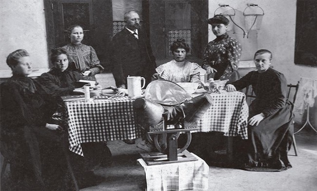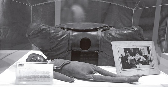 Na exposição, entre os objetos históricos, um deles merece destaque: o phantom (Figura 11). Trata-se de um modelo do útero e pelve feminina confeccionado em couro, madeira e metal, que incluía um modelo de bebê, feito de tecido, com a cabeça de madeira, membros articulados, e uma corda na região do ventre para representar o cordão umbilical, funcionando como um simulador obstétrico em cursos de partos. O objeto pertenceu ao médico austríaco Gabriel Schlatter, que veio ao Brasil no final do século XIX, estabelecendo-se no interior do Rio Grande do Sul. No interior desse estado, até os anos 1930, poucos eram os médicos formados, e as práticas de cura populares existiam livremente (Gertz, 2013). Isso instigou a vinda de muitos profissionais – formados ou não – de outros países, como Alemanha, Áustria e Itália, entre eles o médico naturalista Gabriel Schlatter. Preocupado com o problema da febre puerperal, o doutor Schlatter construiu seu próprio phantom para ministrar aulas no primeiro curso de partos do interior do estado, criado por ele no início do século XX (Segabinazzi, 2016). Na exposição, fotografias do arquivo pessoal doado pela família do médico mostram doutor o Schlatter com turmas de alunas (Figura 12).