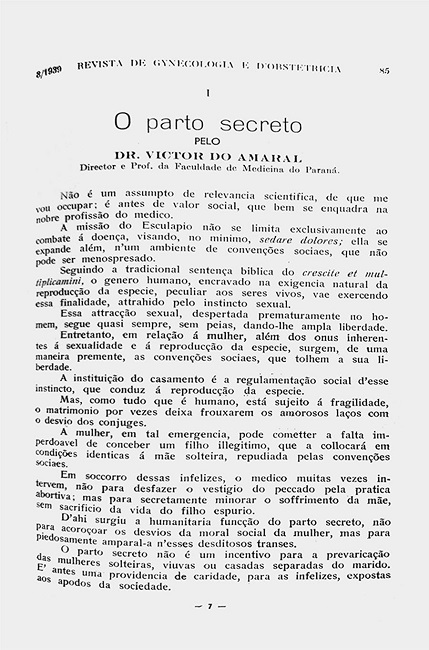 A título de exemplo sobre a amplitude dos assuntos abordados, destacamos, no número de agosto de 1939 da Revista de Ginecologia e D’Obstetrícia, o artigo escrito por um médico atuante no estado do Paraná, doutor Victor do Amaral. Nesse estudo é observada a descrição da prática definida pelo autor como “parto secreto”, que consistia na assistência às mulheres gestantes cujos fetos eram considerados “ilegítimos” ou fruto de “defloramento”. Nesse contexto, o médico descreve a negativa na prática do aborto com a oferta de assistência ao parto de forma secreta, mencionando também a presença de parteira dentro da maternidade. Artigos como esse constituem fontes importantes para os estudos que investigam, entre outros temas, o discurso médico sobre aborto, as condições morais vigentes na sociedade que influenciavam a prática assistencial e ainda o convívio entre o profissional médico e a parteira dentro de um espaço institucionalizado de assistência.
