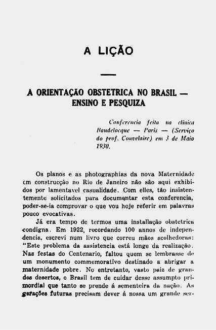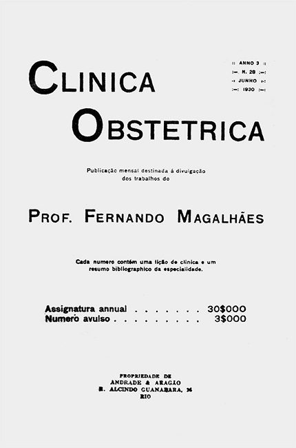 Em outro periódico localizado na biblioteca da Maternidade-Escola, a saber, a revista Clínica Obstétrica, destacamos o artigo intitulado “A orientação obstétrica no Brasil: ensino e pesquisa”. Trata-se de um texto apresentado em uma conferência realizada em Paris, assinado pelo médico Fernando Magalhães, em junho de 1930. O periódico apresenta-se como uma publicação destinada ao registro dos trabalhos desse profissional, conforme exposto na capa da publicação. No artigo mencionado, o autor aborda questões relevantes para a compreensão histórica da atuação dos médicos e, especificamente, da constituição da prática obstétrica na sociedade. Fernando Magalhães destaca a construção de uma nova maternidade no Rio de Janeiro, citando a importância de tratar-se de uma instituição separada de um hospital. Reafirma a visão do papel social específico da mulher na sociedade naquele contexto, definido pelo seu sexo biológico e, atrelado a ele, o papel da obstetrícia como mantenedora das “obrigações raciais”. Assim, segundo Magalhães (1930, p.74),