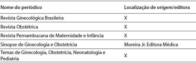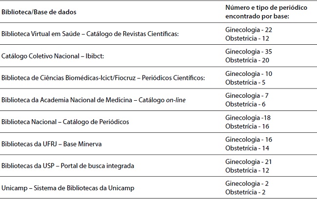 Nessa etapa foram localizados periódicos sobre ginecologia e obstetrícia em oito bibliotecas ou bases de dados, apresentadas nas Tabelas 1 e 2: