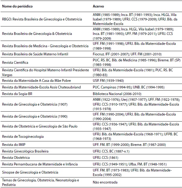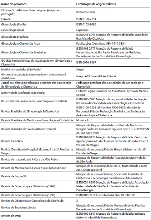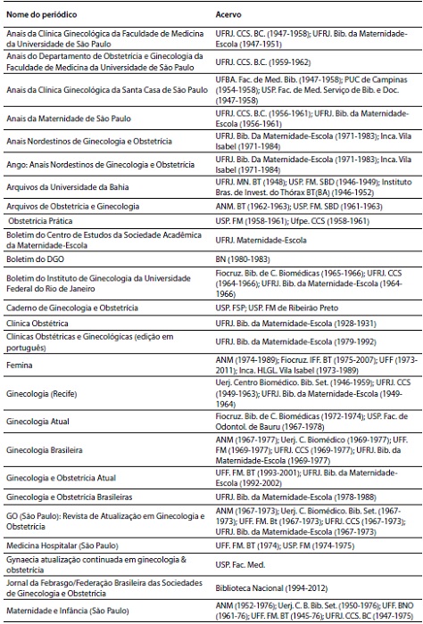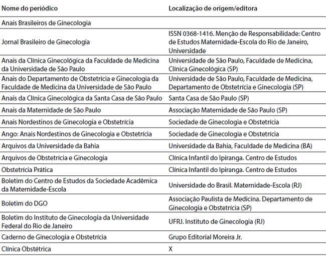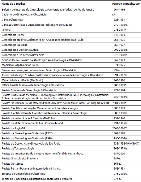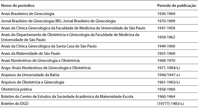 No Brasil, um levantamento realizado no ano de 2016 identificou 47 títulos de periódicos especializados em ginecologia e/ou obstetrícia, publicados entre 1861 e 2010, disponíveis em acervos abertos ao público. Nesse conjunto, sete títulos de periódicos eram continuação de títulos anteriores, contabilizando, na realidade, quarenta publicações diferentes, conforme demonstrado nas tabelas que acompanham este estudo.