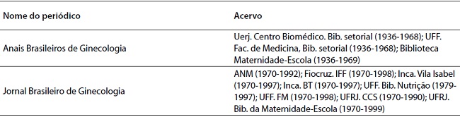 Após o levantamento inicial, as buscas foram direcionadas para os acervos localizados no Rio de Janeiro, para a realização da análise dos periódicos encontrados. O acervo da biblioteca da Maternidade-Escola da Universidade Federal do Rio de Janeiro foi o local com mais periódicos encontrados nas áreas de ginecologia e obstetrícia para o período pesquisado, sendo, por isso, escolhido como o primeiro local para a realização da análise de acervo.