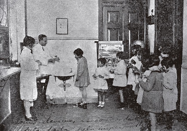 Em muitas escolas primárias e jardins de infância, a prática da escovação dos dentes foi introduzida na rotina dos escolares, sendo os professores, dentista e enfermeiras responsáveis por supervisionar o asseio dos alunos e a escovação, que era demonstrada passo a passo para ser aprendida e adotada, a exemplo da aula prática dada às crianças pelo doutor Campos de Oliveira.