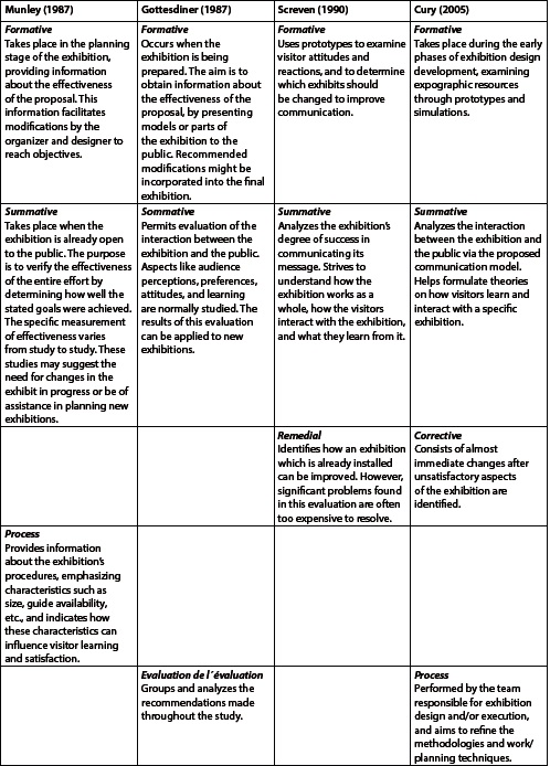 Screven (1990) presents a type of evaluation that closely resembles the préalable evaluation described by Gottesdiener (1987) which he dubs “Front-End Evaluation,” carried out before the exhibition design is defined. Likewise, both Screven and Gottesdiener suggest the same approach (using different names) for the final step, “remedial” and “Évaluation de l’évaluation,” respectively. The attributions of remedial evaluation are found within the summative evaluation described by Munley, while Gottesdiener does not describe the possibility of modifying an ongoing exhibition.