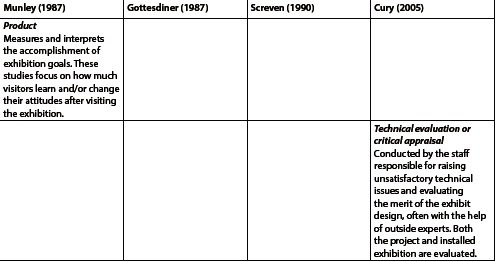 In the same way, Cury (2005) postulates categories similar to those described by the aforementioned authors. Cury also details the process evaluation performed by the team responsible for exhibition design and/or execution, in which the aim is refining methodologies for work and planning techniques. This evaluation differs from the “process evaluation” described by Munley, which seeks to identify the characteristics that influence visitor learning and satisfaction, and possibly approaches Gottesdiener’s “évaluation de l’évaluation.” As the last category, Cury defines “technical evaluation or critical appraisal,” which is carried out by the staff responsible for identifying unsatisfactory technical issues and assessing the design of the exhibition. This often involves assistance from external guests, thus differing from the “product evaluation” described by Munley, which evaluates how many visitors learned something during a visit.