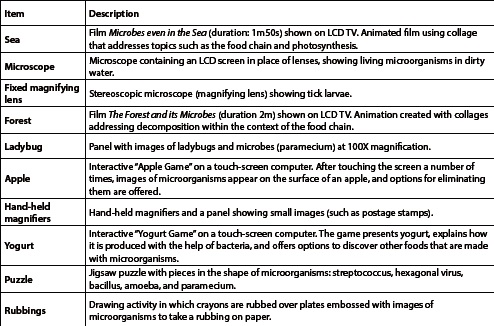 The exhibition was redesigned and the content defined according to the results of evaluations conducted up to this point. A total of ten exhibits (or items) were designed to encompass the five thematic lines/themes redefined by the executive team (Chart 2), and the exhibition was named “The Giant World of Microbes.” These exhibits incorporate diversity in expographic strategies, and consequently facilitate more in-depth identification of the items that attract children to the themes of the exhibition. In this way three-dimensional objects for handling interactive software, pictorial and audiovisual resources, and contemplative exhibits (corresponding to the “learning environment” of the investigation) were included in the new proposal. The premise of the educational practices proposed is to facilitate interaction within the visiting group, thereby emphasizing the importance of a more capable person in mediating between the child and scientific knowledge.