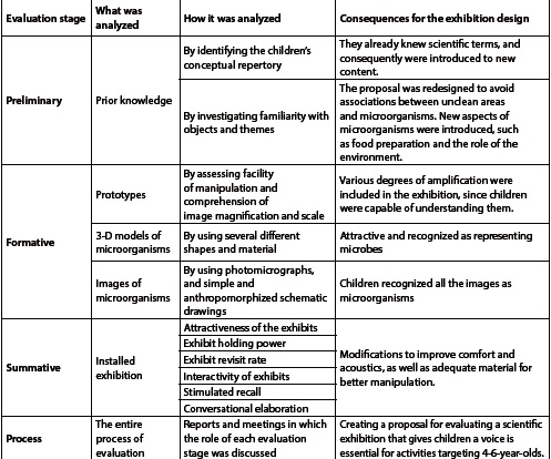 To serve numerous children up to six years of age who visit the Museum of Microbiology at the Butantan Institute, a new exhibition was planned and implemented. Qualitative and quantitative evaluations were performed during these processes, from conception to implementation. The premise underpinning the exhibition considered the children’s understanding and expectations of microorganisms, consequently making the young visitor’s voice a decisive factor in selecting the exhibits to be displayed in the exhibition. In this article, we present how the evaluation process can boost the engagement of 4-to-6-year-old children in developing and implementing a science museum exhibition.