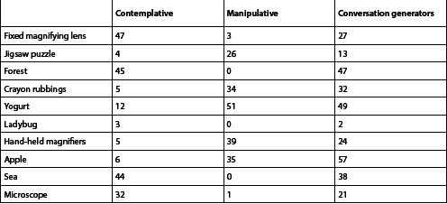 The data presented here clearly indicate that interactive activities most motivated the 4-to-6-year-olds to become involved in the exhibition, and were also the most attractive. The apple and yogurt games, crayon rubbing activity, and handheld magnifiers were the most attractive items, with the highest holding power, and with the exception of the crayon rubbing activity, were recalled the most after the visits.