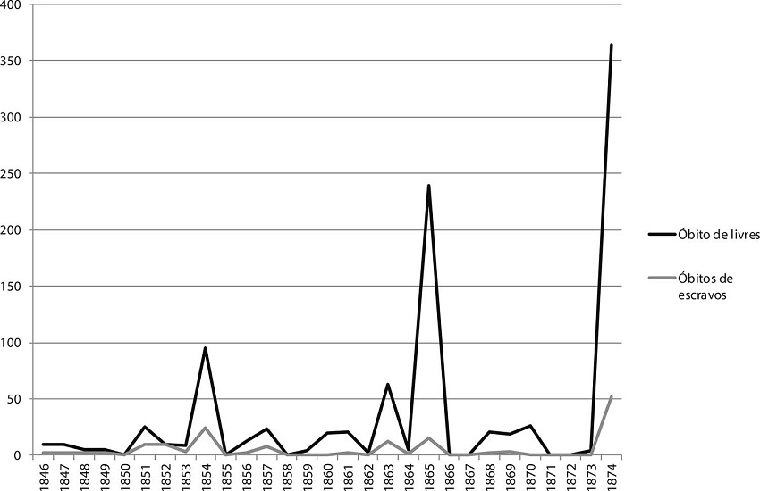 A análise dos registros de óbitos daqueles que padeceram em 1865, contudo, mostrou que a maioria dos atingidos foi de soldados do Corpo de Voluntários da Pátria ou da Guarda Nacional, fato que não exclui, mas minimiza o impacto entre a população da cidade.20 Informando o estado de salubridade da província em 1866, em seu longo relatório à Assembleia Provincial, o então vice-presidente Antonio Augusto Pereira da Cunha foi sucinto ao analisar o surto epidêmico ocorrido no ano anterior. Segundo ele: