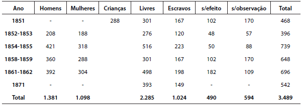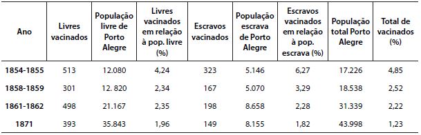Entre 1851 e 1871, encontramos registros oficiais de 3.489 pessoas em Porto Alegre que se submeteram à vacinação, entre homens, mulheres e crianças. Desses, 2.285 eram sujeitos livres e 1.024, escravos. Mesmo que os dados possam estar incompletos – o que supomos pela falta de registro de vacinação em crianças para os anos posteriores a 1851 –, os números expostos são representativos para a análise da funcionalidade da vacinação e também da resistência das pessoas em contribuir para o sucesso do preventivo, pois a indicação “não foram observados”, que aparece na tabela como “s/observação”, significa provavelmente que os vacinados não voltaram após os oito dias para fornecer o pus necessário a novas inoculações.11