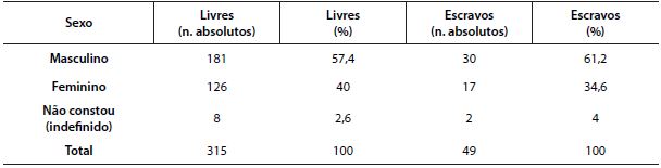 Um último dado que pretendemos analisar quanto ao perfil mais geral da população que faleceu por varíola em 1874 é justamente o sexo daqueles indivíduos. Observando a Tabela 4, vemos que não houve proporção no que se refere aos óbitos de homens e mulheres livres. O mesmo caso foi verificado entre a população escrava.