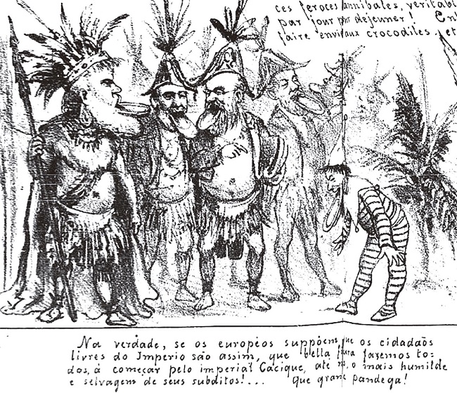 Clearly, arguments highlighting the personal rights of the Botocudos veiled other anxieties that had more to do with Brazil’s image abroad. A series of caricatures published in the Revista Ilustrada in late 1882 shows that the critics of the journey of the Botocudos were less concerned with the well-being of the performers than with the reputation of the Brazilian Empire. What was at stake was not only the way the Botocudos would be exhibited: people were much more concerned about how Europeans would view them, not as some aspect of Brazil’s antiquity, but as representatives of contemporary Brazil. According to this perspective, while the gazes directed at the Botocudos in the Rio exhibition ascribed them the status of scientific curiosities or objects of popular entertainment and were thus largely unproblematic, the imagined European stare would interpret them as a materialization of Brazil’s savagery and unsuitability for civilization. The caricature of Emperor Pedro II as a Botocudo cacique expressed this idea while simultaneously adding a dimension of mockery.