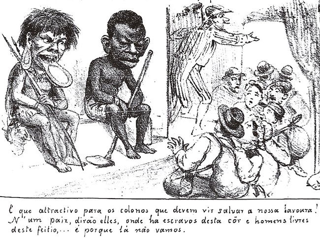The social and economic transformations prefigured by the gradual demise of slavery formed a backdrop for the ensuing debate. In particular, the Revista Ilustrada pointed to the potentially negative impact of such savage displays on Brazil’s attempts to attract European immigrants. Policies to boost immigration not only responded to the economic needs of planters, but also reflected a widespread belief that only Europeans could uplift Brazilian society and remove the negative stigma slavery had produced around manual labor. At the same time, the ideal of “whitening” Brazilian society gained followers among the governing elites (Skidmore, 1974, p.24). For large parts of the governing elite, Europe was the natural point of cultural reference, and its demographic surplus was expected to aid Brazil in its internal civilizing mission. But a paradox persisted up until the abolition of slavery: while Brazilian politicians saw immigration as a solution to the stigmatization of work, the continuing presence of slavery was a major impediment, since immigrants would compete with captives and not encounter internal markets to sell their agricultural products (Costa, 1966, p.70). The caricature in the Revista Ilustrada implied that this situation would become even more complicated once Europeans realized that “savages” ranked higher in the social hierarchy than African-descended slaves.
