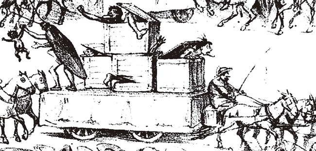 This was not the only reference to the kidnapping. Os Democraticos had a cockroach conducting a Botocudo orchestra (O carnaval, 4 Feb. 1883). The above-mentioned pufe presented by the Fenianos also described the Botocudos as “protected by the big cockroach.” Accordingly, one of their floats featured a group of Botocudos wearing European upper-class couture without trousers, accompanied by a giant cockroach crammed into a hole on the top of a globe, symbolizing their journey around the world (O carnaval, 7 Feb. 1883; Revista Ilustrada, 1883).
