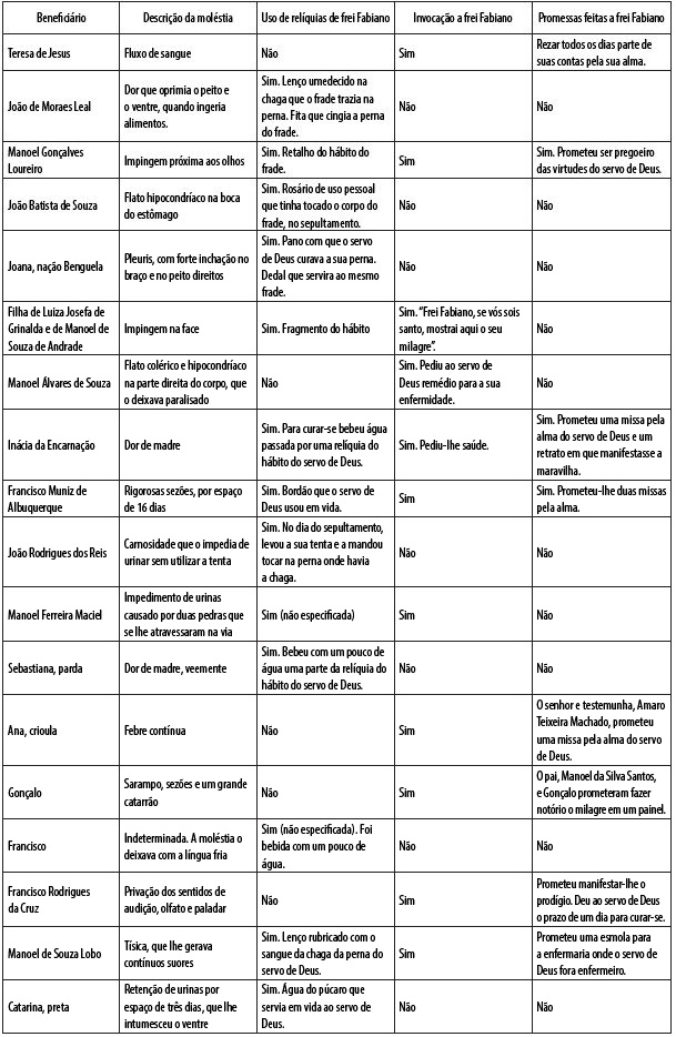 Em síntese, a partir da análise dos 29 testemunhos de supostos milagres aparecidos após a morte de frei Fabiano de Cristo, e de outras fontes secundárias que ser referidas em seu tempo, espera-se constituir um breve quadro das moléstias passíveis de ser curadas graças à intercessão do servo de Deus em questão ou com o recurso a suas relíquias, segundo as crenças religiosas da época.