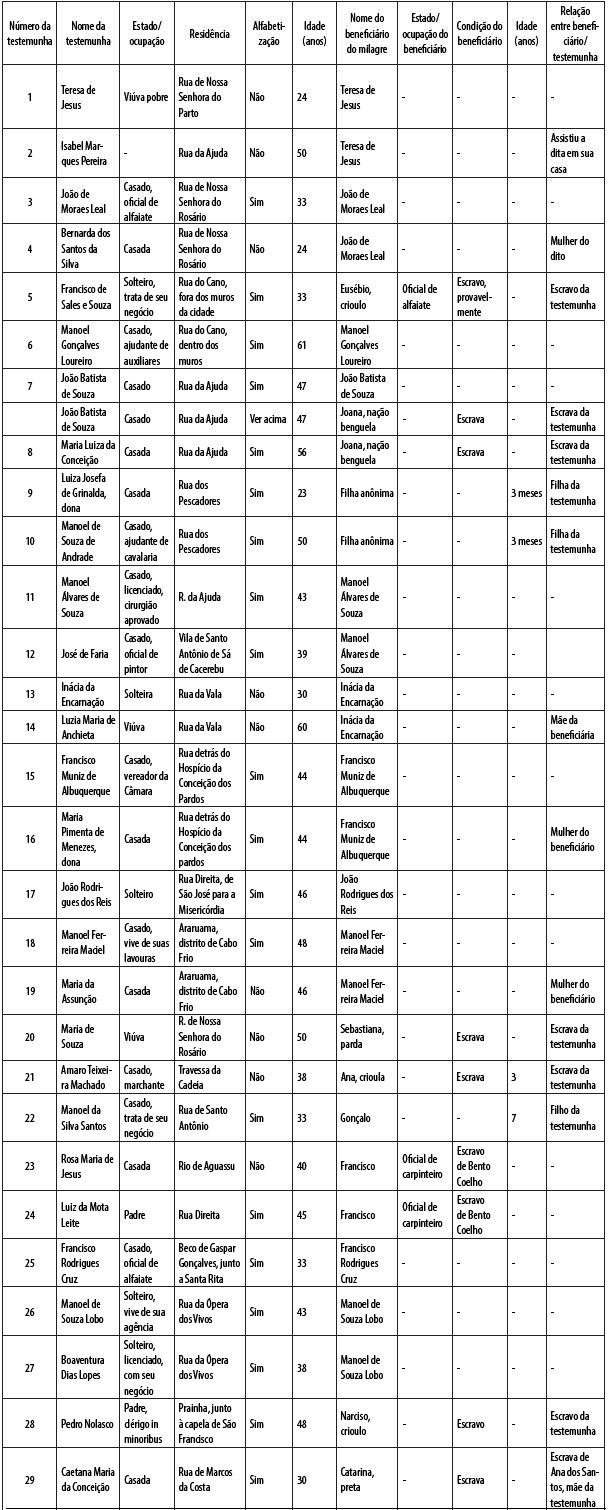 O perfil das testemunhas e dos beneficiários encontra-se mapeado na Tabela 2 . As testemunhas depuseram perante os dois religiosos franciscanos que conduziam o processo ordinário entre os dias 11 de março e 5 de julho de 1748. A maior parte dos benefícios e das curas milagrosas tinha ocorrido no ano anterior, quando a morte de frei Fabiano de Cristo se encontrava fresca na memória dos depoentes. Em alguns casos, as próprias testemunhas foram beneficiadas com milagres e outros prodígios. Abordagens recentes têm destacado o papel dos mediadores de milagres, isto é, indivíduos que tinham acesso e manipulavam as relíquias, e que assumiam um papel ativo nos processos de cura milagrosa ( Archambeau, 2017 ). Testemunhas referidas no processo ordinário podem ser vistas como praticantes de cura (ver Tabelas 1 e 2 ). Por vezes, algumas testemunhas mencionaram nos respectivos depoimentos outras pessoas que haviam presenciado os milagres, que, em alguns casos, foram chamadas também a depor. Do total das 29 testemunhas, 17 (58,6%) eram homens, e 12 eram mulheres. No interior de cada subconjunto, há uma diferença significativa de grau de instrução. Assim, das 12 mulheres que depuseram, somente quatro assinaram o próprio termo. O restante, “por não saber escrever”, teve o respectivo termo assinado pelo notário, o frei Antônio de Santa Catarina de Sena, exceto Rosa Maria de Jesus, que pediu que o marido assinasse seu depoimento. Para o grupo dos homens, a situação é inversa: apenas Amaro Teixeira Machado não assinou o próprio relato. Entre os depoentes, constavam dois sacerdotes e dois licenciados, que possuiriam maior instrução que as demais testemunhas. Quanto ao perfil socioeconômico, não é possível extrair muitos dados. Duas aparecem como donas, título característico daquelas mulheres cujos maridos haviam recebido mercês honoríficas ou exercido cargos na vereança ou na milícia local ( Silva, 2002 , p.95-96). Por sua vez, Francisco Muniz de Albuquerque pode ser inserido na nobreza da terra, pois ocupava a função de vereador na Câmara Municipal.