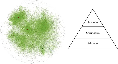 Com esse campo teórico em elaboração, é natural que predomine a óptica de níveis de complexidade do sistema expressa na clássica representação de pirâmide, com suas relações binárias e lineares – a representação de um único subsistema discreto de coautorias expõe a distância da complexidade social real com aquele modelo ( Figura 1). Um senso comum sobre redes de assistências à saúde (RAS), entretanto, já se encontra relativamente bem estabelecido nas práticas. Se, no plano teórico, as RAS podem ser projetadas como redes complexas especializadas inseridas em sistemas complexos, no terreno das práticas são capazes de conferir a objetivação necessária ao pragmatismo operacional. Conceitos acessórios como linhas de cuidado contribuem com esse intento ao permitir operações ainda mais específicas dentro das redes assistenciais (por exemplo, a rede de cuidados à pessoa com deficiência integrada por linhas de cuidado auditivo, físico, visual etc.).