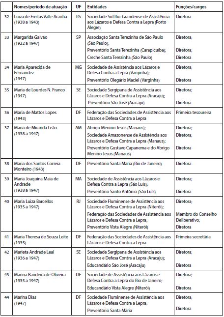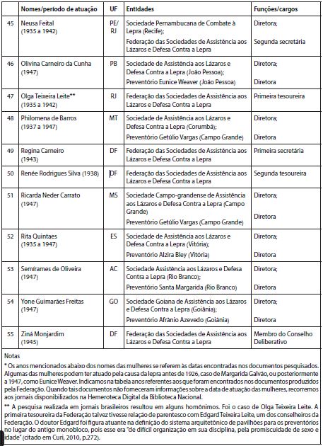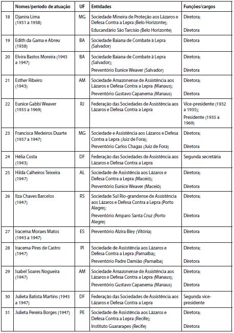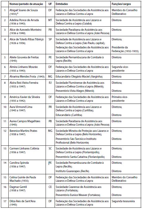 O primeiro passo da pesquisa foi o levantamento dos nomes de mulheres que se envolveram com a causa da lepra. Ele foi realizado tendo como parâmetro a manipulação de três documentos produzidos pela FSALDCL. Um deles foi o Histórico da cooperação privada no combate à lepra no Brasil , de 1938. Trata-se do relatório impresso redigido por América Xavier da Silveira, apresentado ao ministro Capanema; nele, ricamente ilustrado com imagens fotográficas, são expostas realizações da instituição a partir de alguns estados e territórios ( Federação…, 1938 ). O outro documento manipulado foi um relatório datilografado, assinado por Eunice Weaver em junho de 1943 e enviado para a embaixada norte-americana do Rio de Janeiro. Nele são listados nomes de médicos importantes no campo da leprologia no Brasil e também os nomes das então dirigentes das sociedades mantenedoras de preventórios no país ( Federação…, 1943 , p.19 e seguintes). E, por fim, um relatório impresso da federação, provavelmente redigido por Eunice Weaver, publicado em 1945 (com inúmeras imagens fotográficas) sob o título Realizações de julho de 1935 a julho de 1945 ( Federação…, 1945 ). Com estes três documentos, foi possível perfilar nomes de mulheres que atuaram junto à FSALDCL em cargos importantes, em todo o Brasil, de meados da década de 1920 até pelo menos 1945. A esses nomes agregamos outros, a partir do clássico História da lepra no Brasil , de Souza Araújo (1948) , que em seu segundo volume traz a relação das diretoras dos preventórios brasileiros em 1947. Assim, foi possível reunir informações em uma primeira lista ( Quadro 1 ) simples “de nomes de ocupantes de certos cargos ou títulos”, tendo em mente que a criação de listas constitui uma das “matérias-primas com as quais [os] estudos prosopográficos foram e são elaborados” ( Stone, 2011 , p.117).