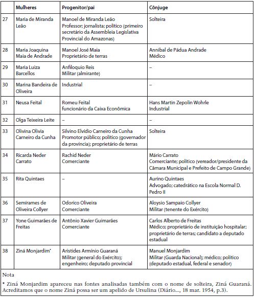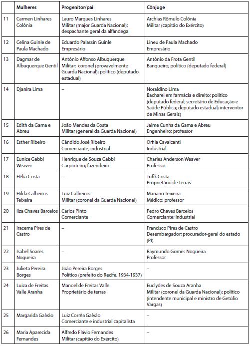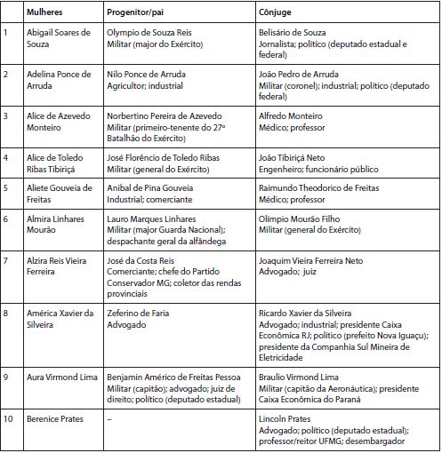 Os aspectos que se destacaram quanto à família de origem ou à constituída pelo casamento foram os seguintes: pais e/ou maridos com carreira militar; ligados a cargos políticos (antes, durante ou depois da chamada Era Vargas, 1930-1945); profissionais da medicina, do direito e professores.