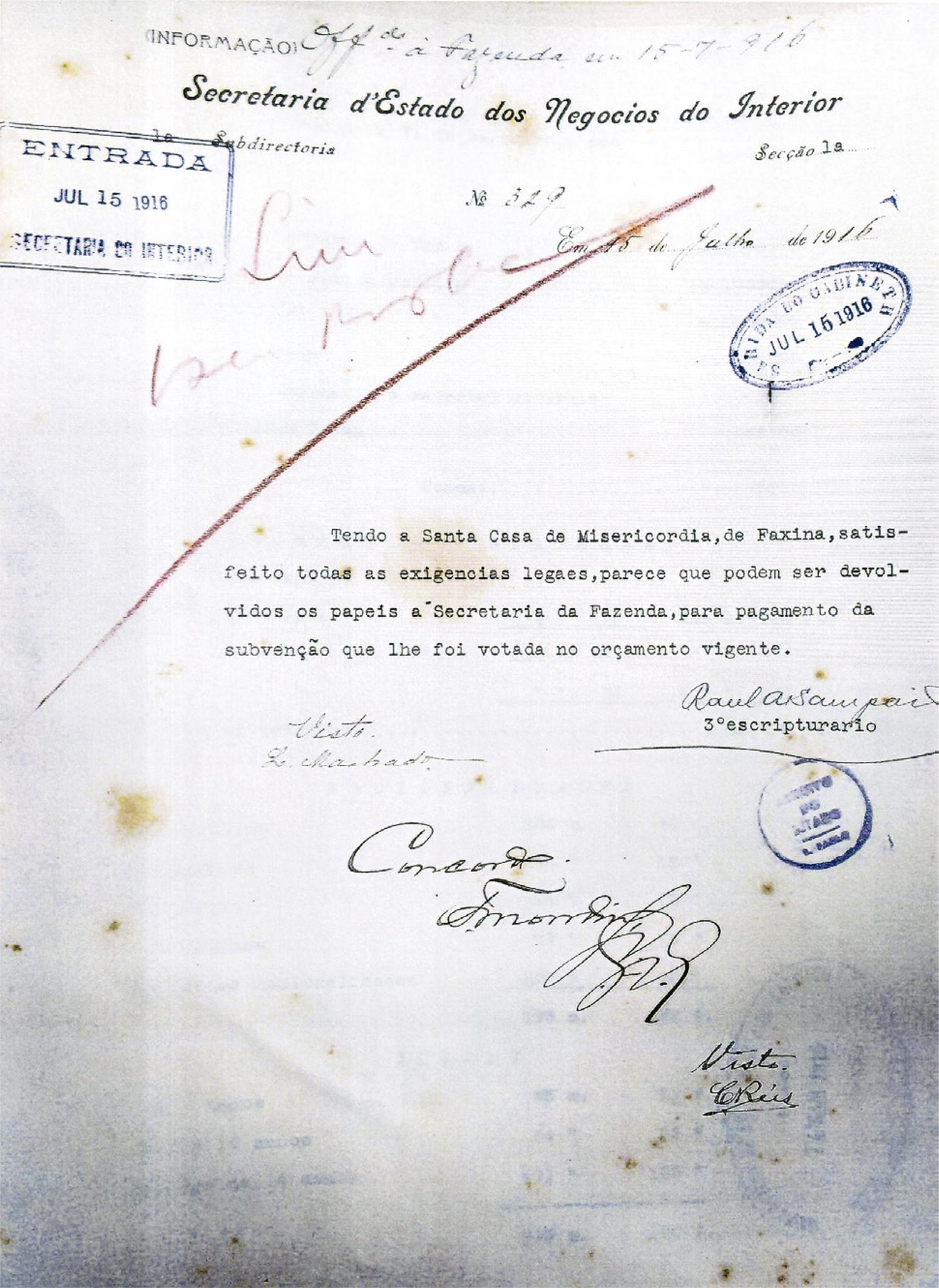 Verifica-se que, mesmo não sendo geridos pelo Estado, os estabelecimentos subvencionados precisavam, a partir da República, ser vistoriados pelo Serviço Sanitário. Vai-se compondo, portanto, um quadro em que a atenção dispensada pela filantropia à assistência era inserida no arcabouço legal do Estado, pelo recebimento constante de subsídios e apoios de toda espécie e pela correspondente submissão às instâncias formais de fiscalização. Os relatórios deveriam ser enviados tanto para as instâncias sanitárias quanto para a Secretaria da Fazenda. O exemplo apresentado reproduz o relatório da santa casa da cidade de Faxina ( Figura 1 ), mas todas as santas casas constantes nos subsídios possuem documentações similares.