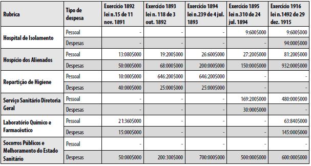 As instituições de saúde específicas criadas no período imperial em São Paulo estiveram presentes nos orçamentos desde suas respectivas criações: o Hospital de Lázaros, de 1802, o Hospital dos Alienados, de 1852, o Hospital de Varilosos, criado em 1880, e a Repartição de Higiene, fundada em 1884. O gasto com o Hospital dos Alienados foi assim descrito: