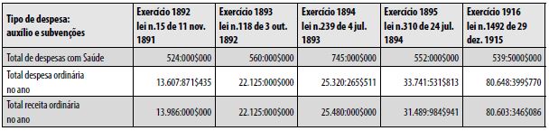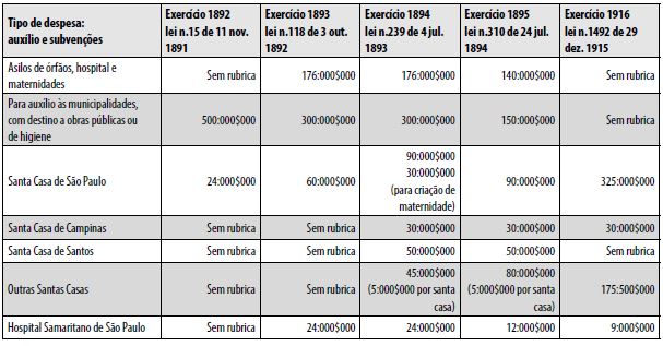Na avaliação dos recursos alocados em serviços de saúde no estado de São Paulo, verifica-se a permanência, ao longo do tempo, das mesmas instituições nas previsões orçamentárias, o que permite confirmar a ideia sobre a formação de uma rede de assistência de diferentes formatos. Como veremos nas tabelas a seguir, o orçamento da província, e depois do estado de São Paulo, pode ser acompanhado nessas duas dimensões: verbas para os órgãos de governo e subvenções aos estabelecimentos particulares ligados à filantropia, benemerência e cuidados. As verbas para saúde eram divididas nas categorias: “Socorros públicos”, relativos à higiene e a serviços de conservação da saúde pública, e “Auxílio e subvenções”.