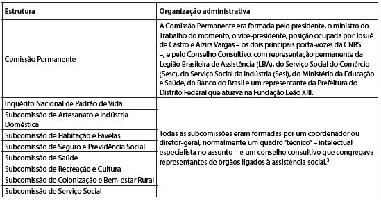 Atrelada a uma comissão permanente para dirigir e coordenar a CNBS, o governo fundou as subcomissões para equacionar o planejamento da assistência social (ver Quadro 1). Foram criadas as subcomissões de Seguro Social, Serviço Social, Habitação e Favela, Saúde, Indústrias Domésticas e Artesanato, Colonização e Bem-estar Rural, Recreação e Cultura e Assistência Técnica ( Vargas, 1952, p.327). Em todas essas subcomissões, destacavam-se os órgãos públicos e intelectuais do Estado ligados ao serviço social. Na comissão permanente, destacava-se a presença do Serviço Social da Indústria (Sesi), do Serviço Social do Comércio (Sesc), da Legião Brasileira de Assistência (LBA) e do Ministério da Educação e Saúde – no período, a pasta de assistência social e educação eram conjuntas (Brasil, 29 set. 1951).