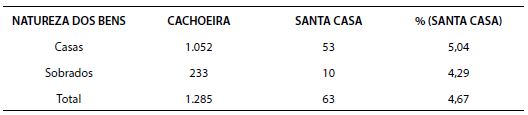 Constata-se, então, que a Santa Casa de Cachoeira construiu um sólido patrimônio imobiliário na cidade onde, em 1863 era proprietária de 63 dos 1.285 prédios registrados por Epifânio José de Meireles em 1866. Quer dizer, a irmandade era dona de 4,67% dos prédios urbanos da cidade de Cachoeira ( Tabela 7).