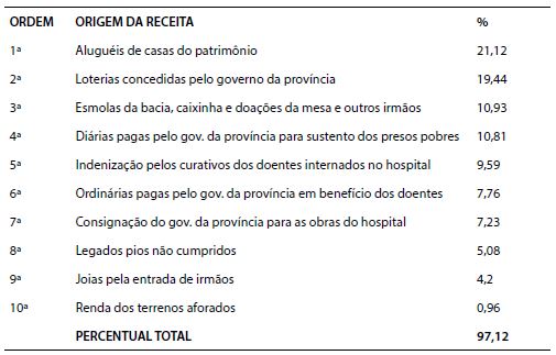 Além disso, no conjunto das dez mais importantes fontes de recursos da confraria ( Tabela 8) que respondiam por 97,12% da receita total, aparece em quinto lugar a “Indenização pelos curativos dos doentes internados no hospital”, responsável por 9,59% da arrecadação, tornando-se assim um dado revelador sobre a importância econômica da prática da “medicina custeada pelo paciente” no período. Respondendo por 2,88% da renda, a Santa Casa ainda arrecadava recursos oriundos dos rendimentos da sacristia da capela, do bangue, da tumba, da horta, dos laudêmios, do imposto dos cereais, dos juros de empréstimos e de apólices e até das “jornadas dos pretos da casa”, quer dizer, ganhos pelos trabalhos externos dos escravos de propriedade da Misericórdia (Cachoeira, 1846a, p.2; 1846e, p.2).