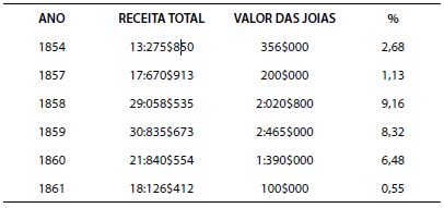 Apenas quanto aos valores referentes aos pagamentos da “joia por entrada do irmão” ( Tabela 1), embora sem computar índices inflacionários, a participação percentual dessa fonte na receita total da irmandade foi bastante variável ( Tabela 2). Por essa razão, alcançou 4,2% da receita total da irmandade, em 5 dos 8 anos do período entre 1853 e 1861, cuja soma total foi 93:803$625 (noventa e três contos, oitocentos e três mil e seiscentos e vinte e cinco réis). Até o final da década de 1860, a receita oriunda das joias por entrada de irmão manteve-se entre as dez maiores fontes de financiamento para o suporte das atividades assistenciais da irmandade (Cachoeira, 1859a, p.2; Bahia, 1854, p.40; 1856b, p.41; 1857, p.32; 1858, p.8; 1859, p.4; 1860, p.36; 1861, p.85; 1863, p.33).