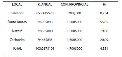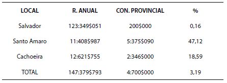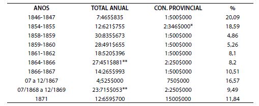 Especificamente para a Misericórdia de Cachoeira, a título de “consignação orçamentária”, foram transferidos recursos financeiros, pelo menos a partir de 1846 ( Tabela 3), com o fim específico de que a Santa Casa pudesse tratar os doentes internados no Hospital São João de Deus, além de assumir a alimentação e a assistência jurídica dos presos pobres, e pagar para que famílias ou “amas de leite” cuidassem de menores “expostos”.