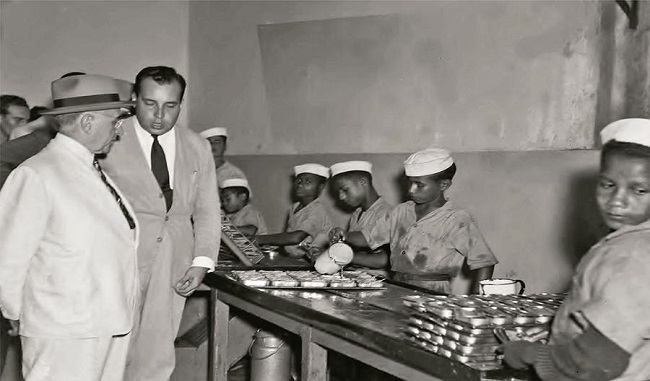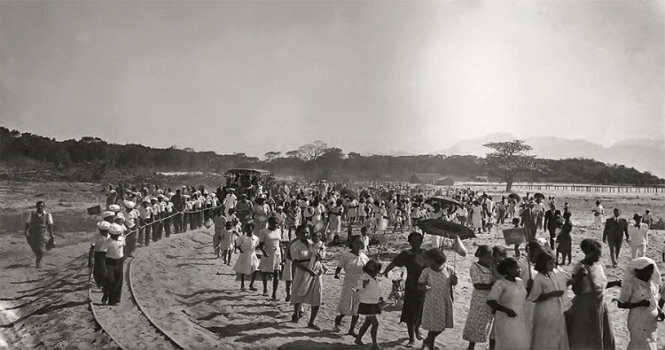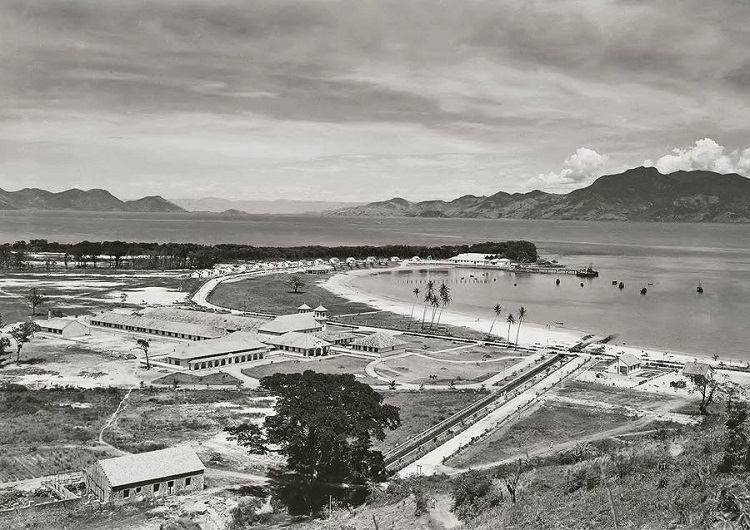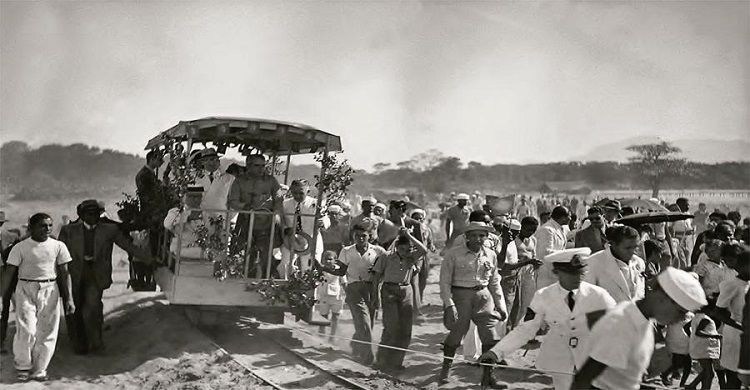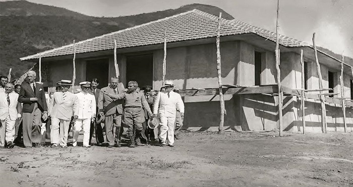 As obras em prol desse empreendimento tiveram início provavelmente no segundo semestre de 1939. 3 No ano seguinte, o presidente da República, Getúlio Vargas, o ministro da Marinha, almirante Henrique Aristides Guilhem, o interventor do estado do Rio de Janeiro, Ernani do Amaral Peixoto, entre outros, estiveram na ilha da Marambaia, em comitiva, onde foram recebidos pela população local e “desfilaram” num bonde puxado por menores com uniforme de marinheiro 4 ( Figuras 1 e 2). Na ocasião, o idealizador e “provedor perpétuo” do ACR, Levi Miranda, juntamente com Romero Estelita Cavalcanti Pessoa, membro do Conselho Fiscal daquela entidade filantrópica, e Rodolpho Fuchs, 5 funcionário do Ministério da Educação e Saúde (MES) cedido pelo governo para colaborar na área de ensino do ACR, os conduziram para conhecer as obras em andamento da EPDV ( Figura 3).