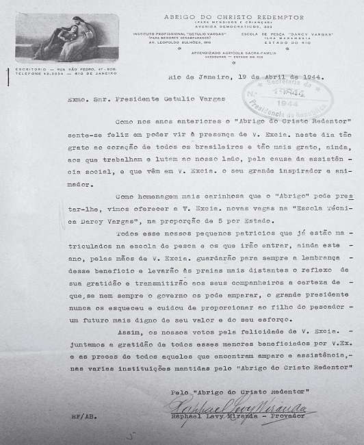 O ensino primário na EPDV teve início em outubro de 1941, com o total de 105 alunos advindos de vários estados do litoral do Brasil, com exceção do Rio Grande do Sul, Maranhão e Pará, que não se fizeram representar. Essas vagas foram ofertadas pelo ACR ao presidente Getúlio Vargas por ocasião do seu aniversário ( ACR, 1938-1945, relatório 1942, p.16). Uma prática mantida em anos posteriores, como é possível constatar por meio de carta escrita por Rafael Levi Miranda a Getúlio Vargas, em 19 de abril de 1944 ( Figura 4).