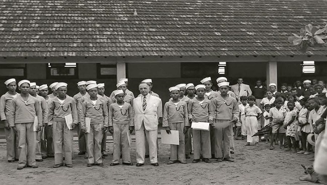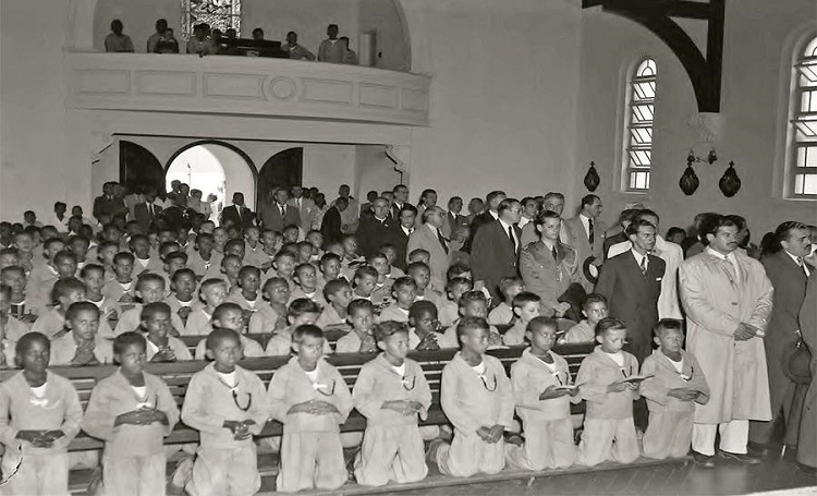 A EPDV funcionava num sistema de internato, com atividades planejadas ao longo do dia, e as visitas aconteciam uma vez por mês. Durante os dias de semana, os alunos assistiam ao total de sete horas de aula, distribuídas em dois turnos, três horas pela manhã e quatro horas à tarde. Todos os dias eles precisavam cumprir obrigações cívicas, como o hasteamento da bandeira e desfile, incluídos domingos e feriados, quando estavam liberados das atividades de estudo e dedicavam-se a práticas esportivas ( Alves, 2010, p.43). As missas também eram diárias e obrigatórias, também em dias de festividade, como na visita de autoridades à instituição ( Figura 5).