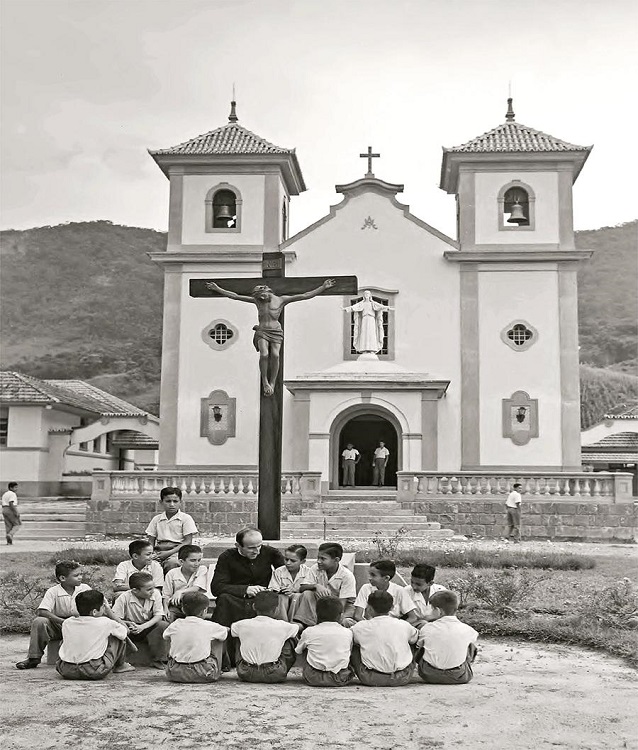 Sendo o ACR uma instituição católica, dirigida e administrada por fiéis dessa religião, não é de surpreender a ênfase concedida ao ensino e às práticas religiosas em todos os seus departamentos. No interior de cada uma de suas unidades, como na Escola de Pesca, existia uma igreja, cuja fachada exibia uma estátua do Cristo com braços estendidos “à humanidade transviada e sofredora” ( Figura 6), e capelães, a quem era entregue a direção espiritual do estabelecimento ( ACR, 1938-1945, relatório 1945, p.15, 37). Estatísticas de missas, confissões, batismos, extremas-unções, primeiras comunhões, crismas etc. eram disponibilizadas nos relatórios oficiais da entidade filantrópica ( Caminha, 2012, p.81, 82), nos quais, por exemplo, se encontra a informação de que, apenas em 1942, foram realizados 7.783 atos religiosos na Escola de Pesca (ACR, 1938-1945, relatório 1942, p.34). O “provedor perpétuo” Levi Miranda acreditava que por meio do “amparo ao menor” o ACR prestava um imenso serviço ao Brasil, mas, ao mesmo tempo, encontrava “um excelente meio para levar almas ao encontro do Cristo” ( ACR, 1938-1945, relatório 1943, p.17).